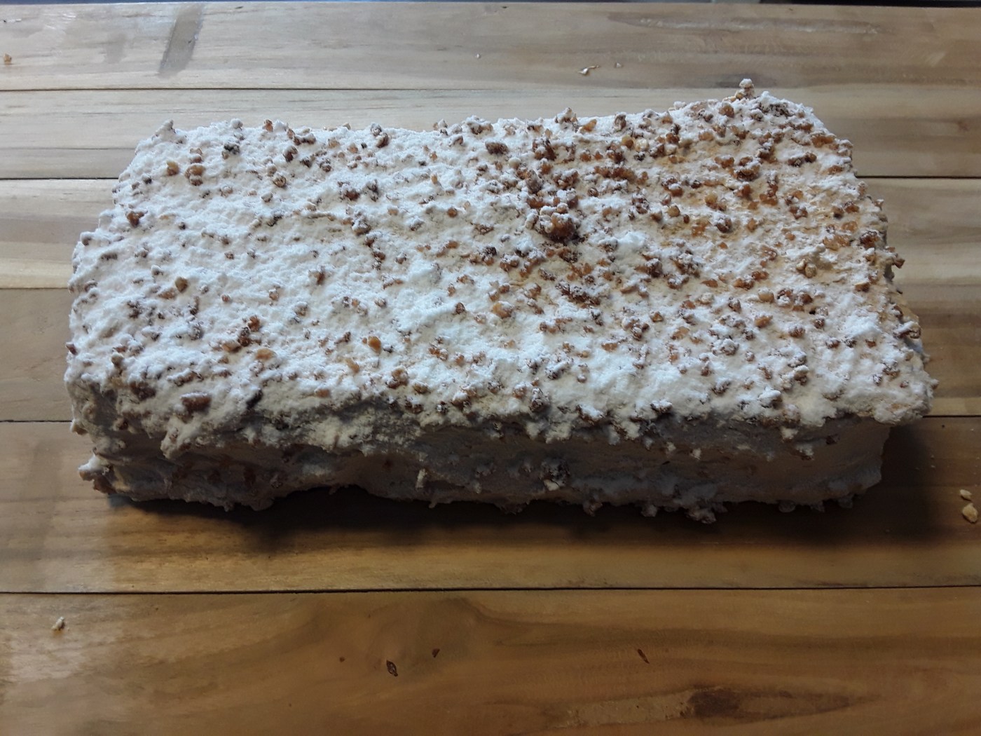 Twee plakken versgebakken hazelnootschuim gevuld met een romige mokka crème. Afgewerkt met een krokante hazelnoot-suikermix en poedersuiker.