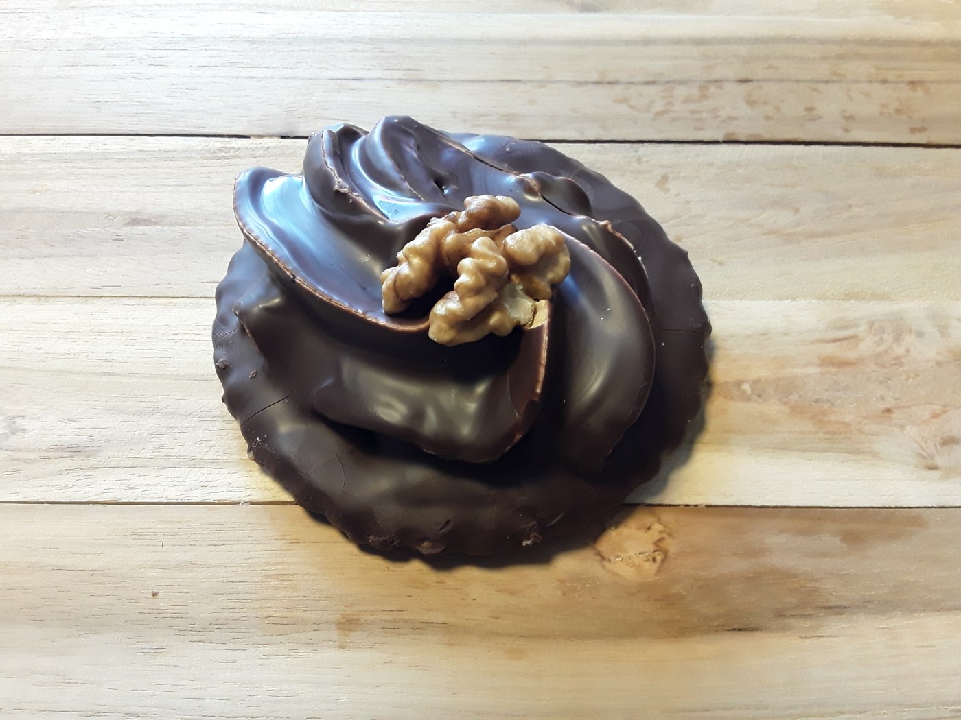 Een krokant koekje, opgespoten met romige mokka crème, omgeven door pure chocolade. Afgewerkt met een hele walnoot.