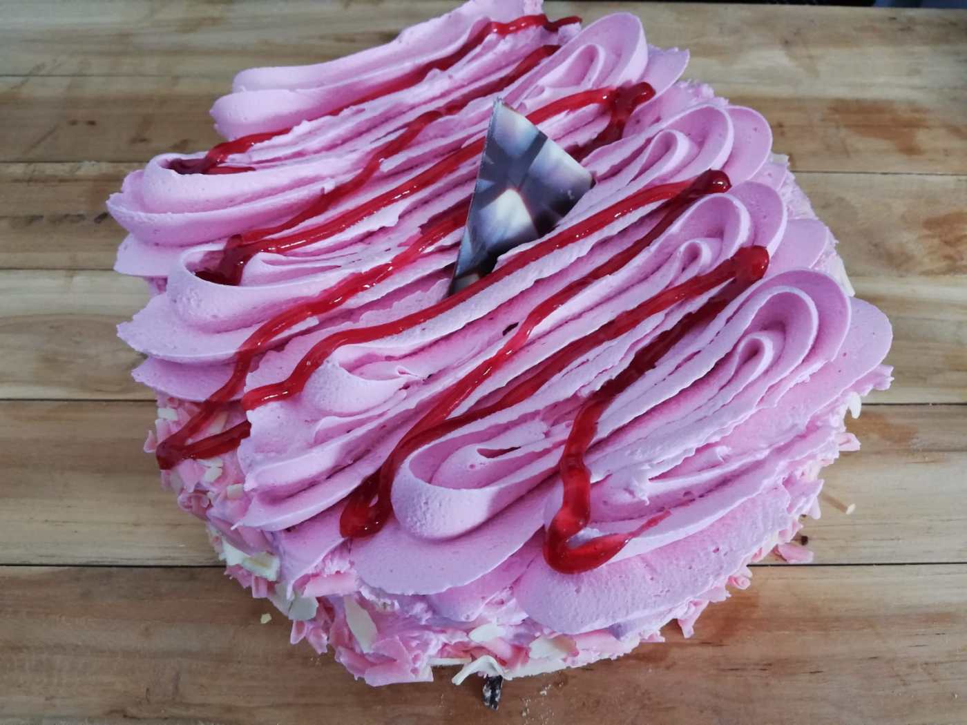 Een basis van versgebakken hazelnootschuim die is aangezet met chocoladeschaafsel. Afgewerkt met aardbeien crème en aardbeienjam.