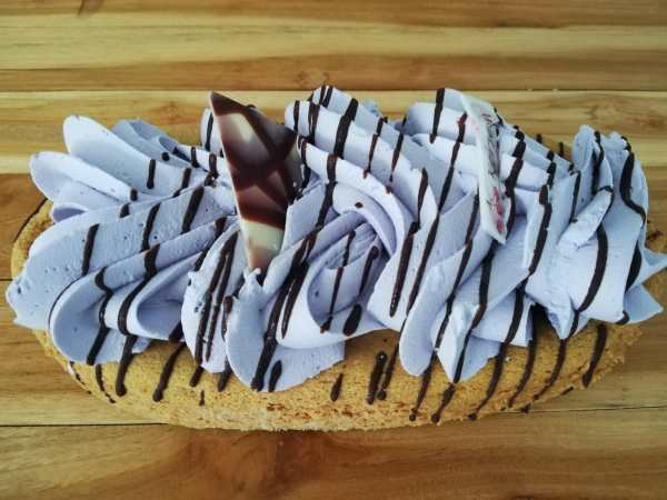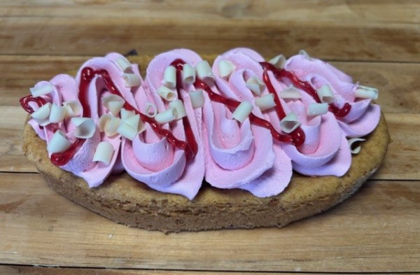 Een slof rijkelijk opgespoten met kersenjam en crème. Afgewerkt met chocolade en een eetbaar schildje.