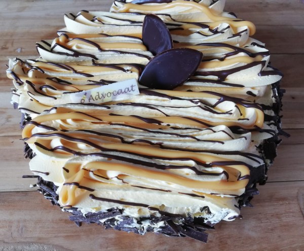 Een basis van versgebakken hazelnootschuim afgewerkt met chocolade, crème en een smakelijke advocaatcreme.