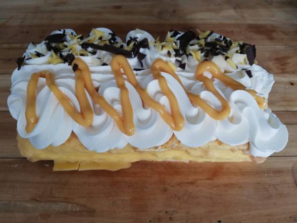 Een slof rijkelijk opgespoten met advocaatvulling. Afgewerkt met bolletjes luchtige crème en chocoladestreepjes.