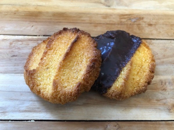 Een heerlijke kokosklauw, krokant van buiten en zacht van binnen. Verkrijgbaar in twee varianten, te zien op de foto.