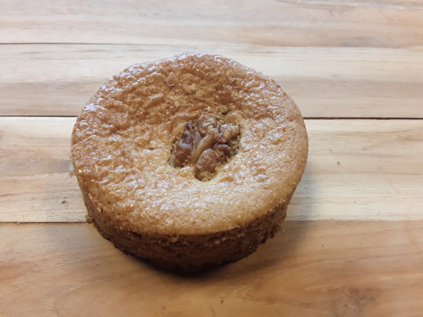 Een heerlijke koek, gevuld met een rijke karamelspijs en afgewerkt met een halve walnoot.