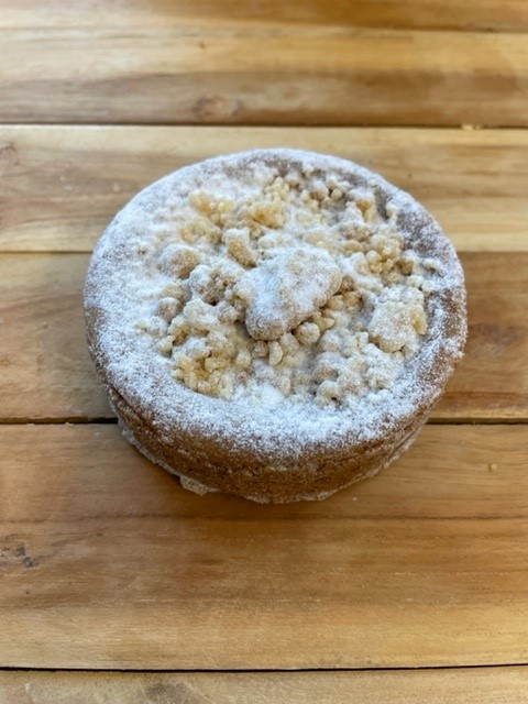 Een heerlijke koek gevuld met zoete appel, afgewerkt met kruimels en poedersuiker